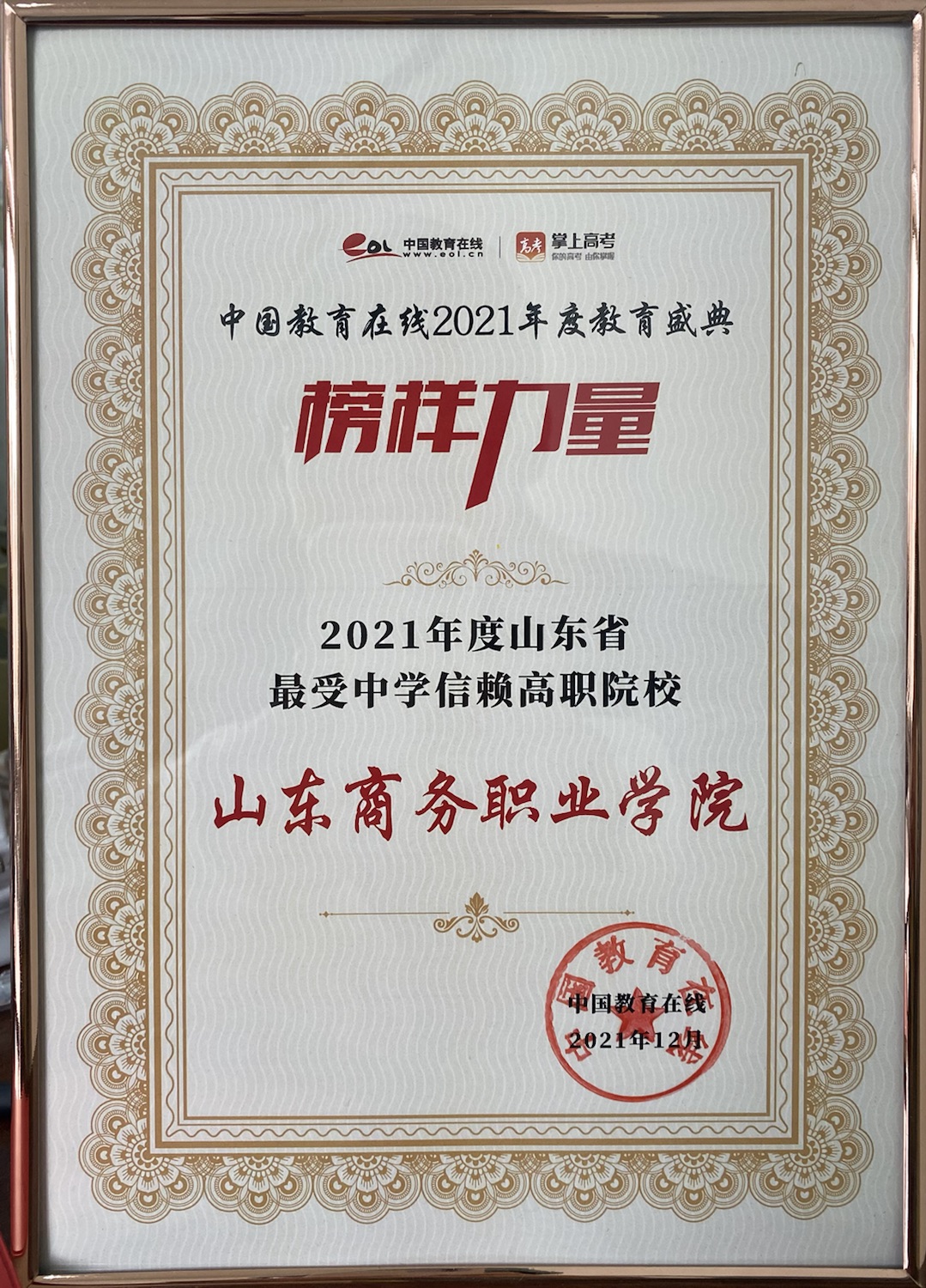 本站讯 近日,中国教育在线 掌上高考“榜样力量——2021年度教育盛典”评选获奖名单揭晓,我校荣获“2021年度山东省最受中学信赖高职院校”奖。