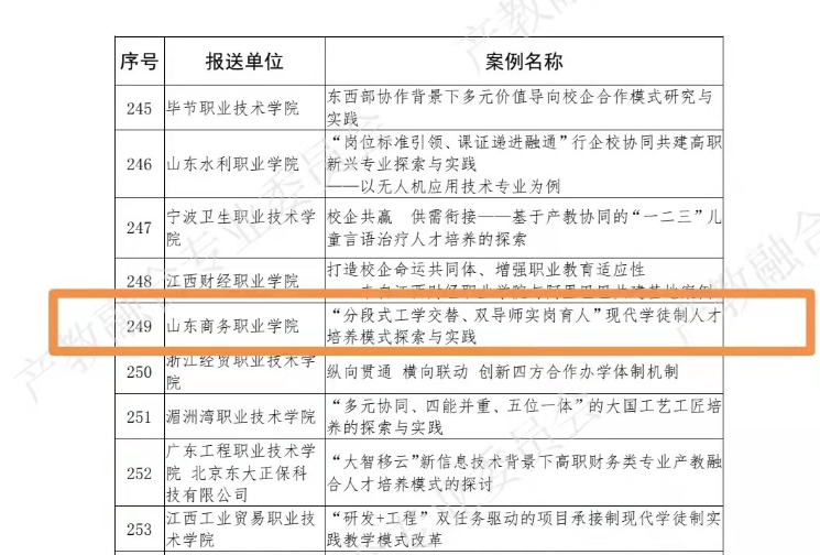 本站讯 近日,教育部委托中国教育发展战略学会产教融合专业委员会遴选出485个产教融合校企合作典型案例,我校经济管理学院选送的《“分段式工学交替、双导师实岗育人”现代学徒制人才培养模式探索与实践》案例成功入选。