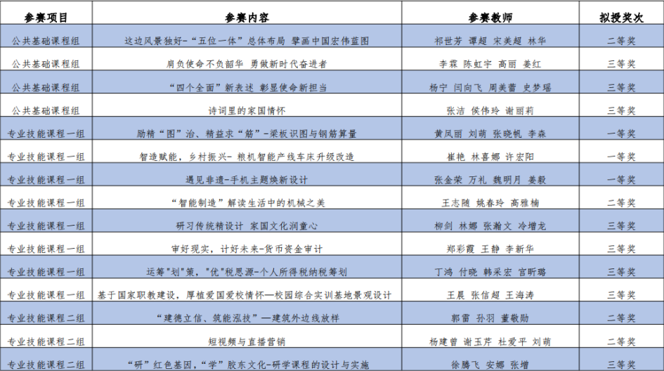 本站讯 日前,烟台市公布了2022年全市职业院校教师教学大比武活动拟获奖作品名单,此次是我校第三次参加市赛,15支参赛队伍全部获奖,其中,一等奖3项,二等奖4项,三等奖8项。