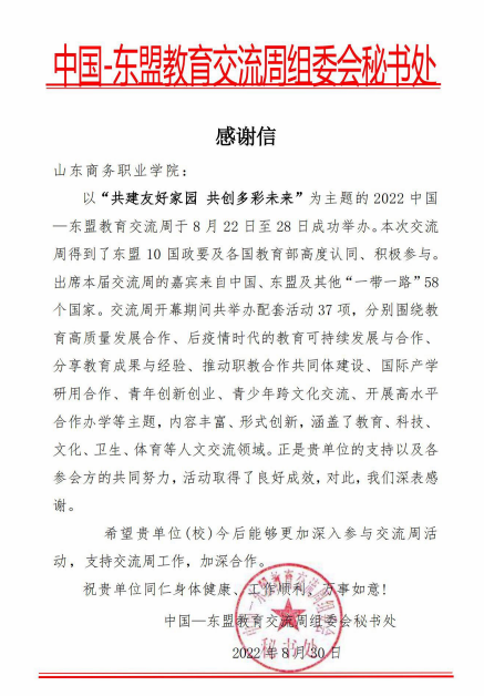 本站讯 以“共建友好家园共创多彩未来”为主题的2022中国—东盟教育交流周于8月22日至28日成功举办。近日,中国—东盟教育交流周组委会秘书处向我校发来感谢信,向我校对本届交流周的贡献表示感谢。