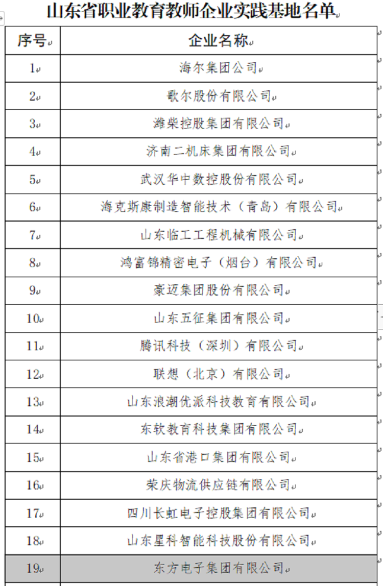 本站讯 近日,山东省教育厅、山东省发改委、山东省工信厅、山东省国资委、国家税务总局山东省税务局等五部门联合下发《关于公布山东省职业教育教师企业实践基地的通知》(鲁教师函〔2023〕5号),确定海尔集团公司等49家企业为山东省职业教育教师企业实践基地,我校信息工程学院推荐的校企合作单位东方电子集团成功入选。