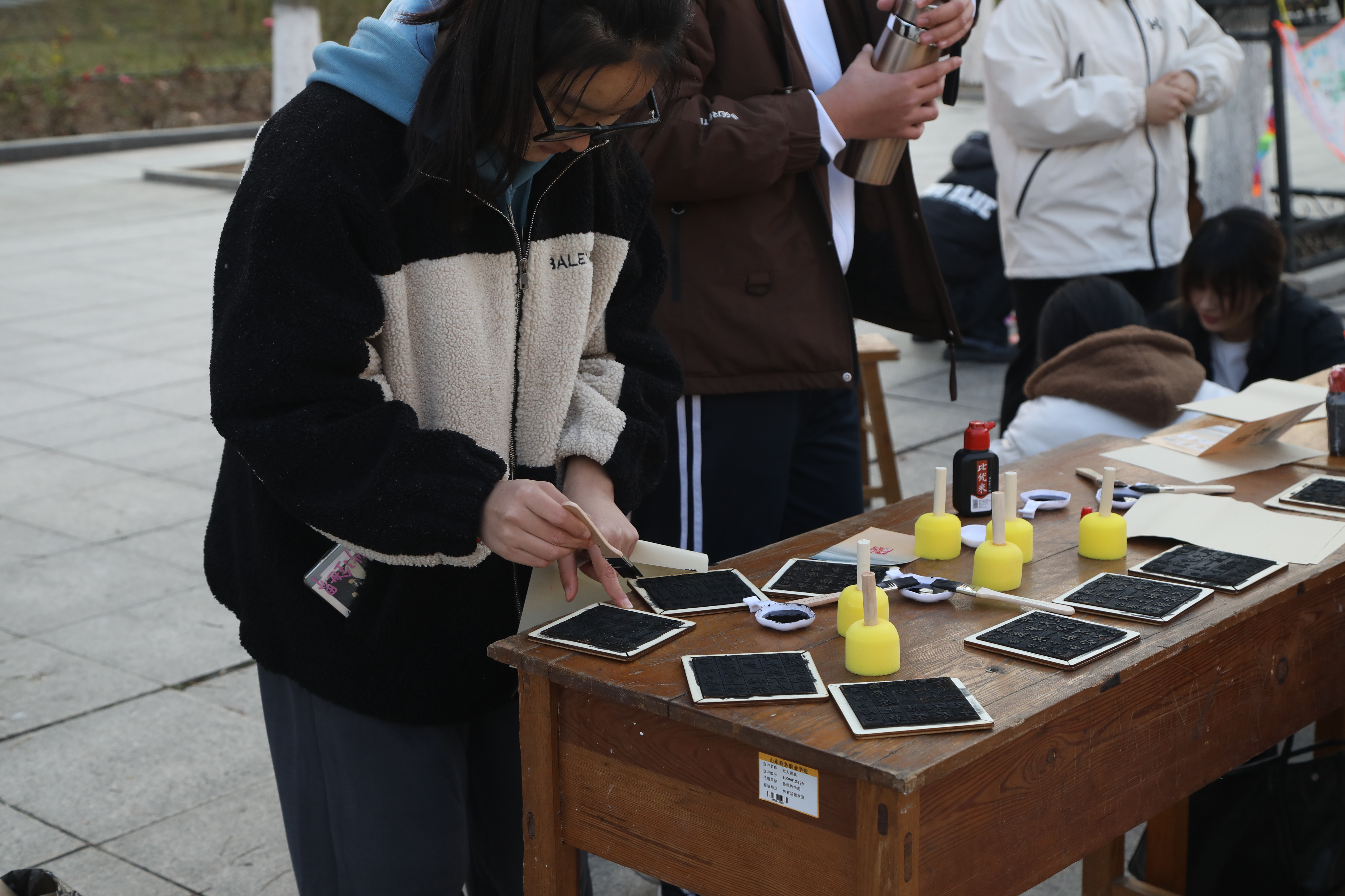 活字印刷的展位前也聚拢了许多同学,大家将墨汁研磨后认真涂画在自己选好的古诗拓字板上,在浓浓墨香中真切体会中华优秀传统文化的魅力。