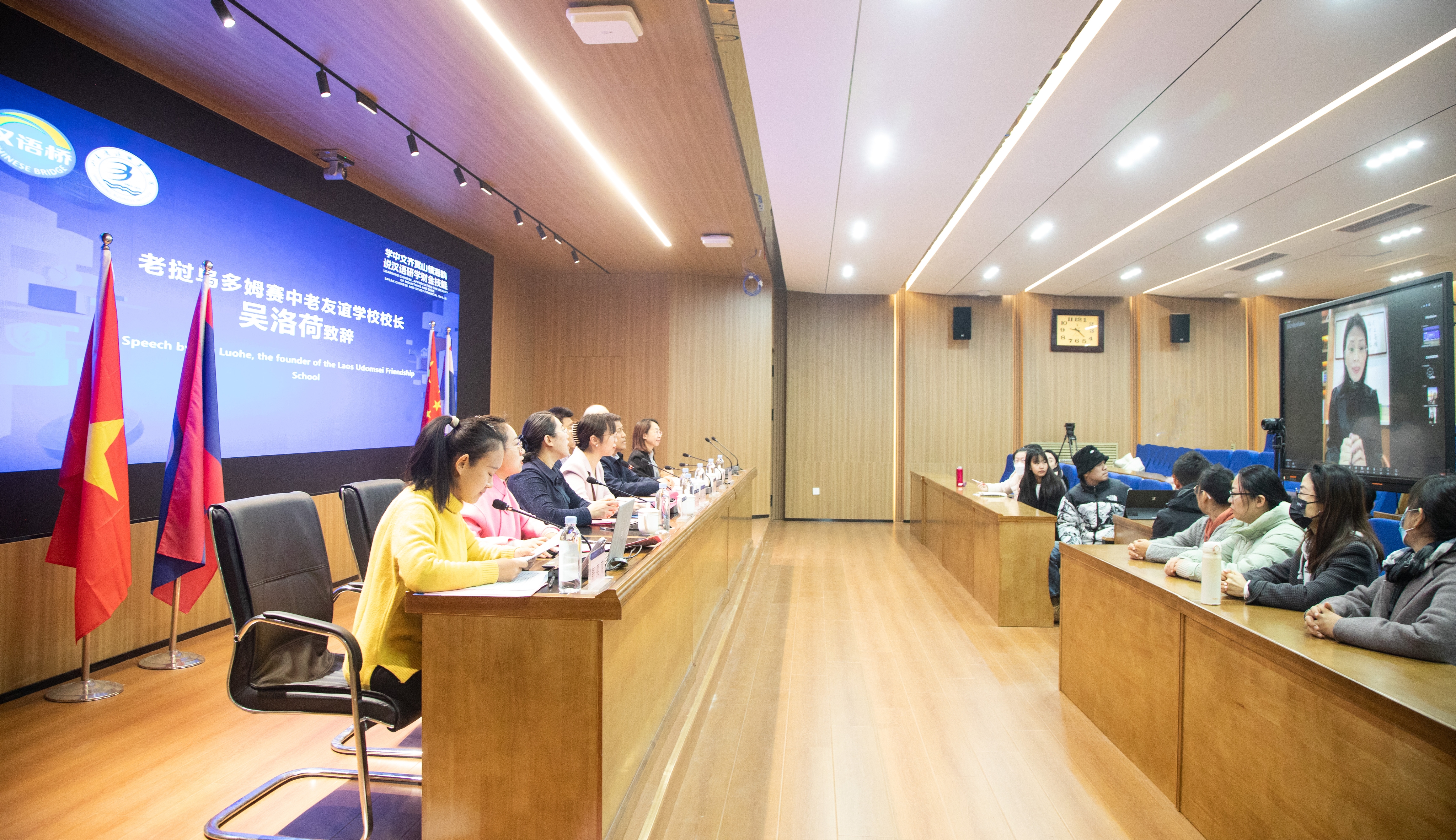 吴洛荷代表中老友谊学校对项目的成功举办表示热烈的祝贺,她简要介绍了学校在创办历程和国际化办学情况,回顾了与我校开启共商合作、共话发展的情景,并期待借助“汉语桥”项目的开展,进一步增进两校之间的互信了解,为推动中老友谊持续健康稳定发展作出积极贡献。
