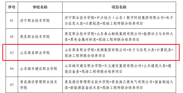 本站讯 近日,山东省教育厅公布了山东省第二批现场工程师专项培养计划项目名单,我校由信息工程学院牵头申报的“山东商务职业学院+浪潮集团有限公司+电子与信息大类+计算机类+现场工程师联合培养项目”成功入选。