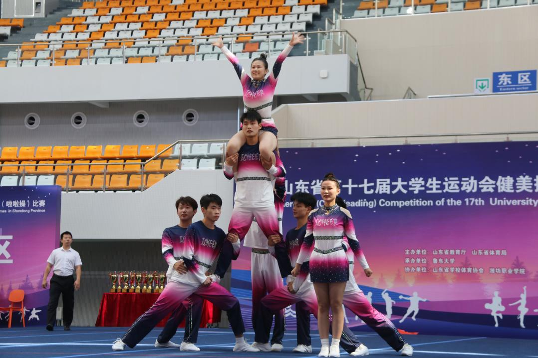 本站讯 10月2日,山东省第十七届大学生运动会健美操(啦啦操)比赛在潍坊职业学院开幕。本次比赛由山东省教育厅、山东省体育局主办,为期4天,设有10个比赛项目,共有来自全省各高校的72支代表队、近800名运动员齐聚潍坊,展现青春活力与拼搏精神。我校参赛队伍在比赛中获得集体技巧啦啦操第二名,集体街舞啦啦操第四名,团体总分第七的好成绩。