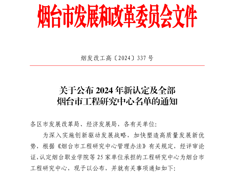 烟台市工程研究中心是烟台市科技创新体系的重要组成部分,是市发展改革委根据科技强市和绿色低碳高质量发展的战略需求,以培育科技力量为主攻方向、以科技赋能产业为实施路径、以服务国家、省、市重大战略任务为发展目标,由研究开发能力和综合实力较强的高校、企业、科研院所等企事业单位共同设立的创新联合体,是市内最高等级的技术创新平台之一。