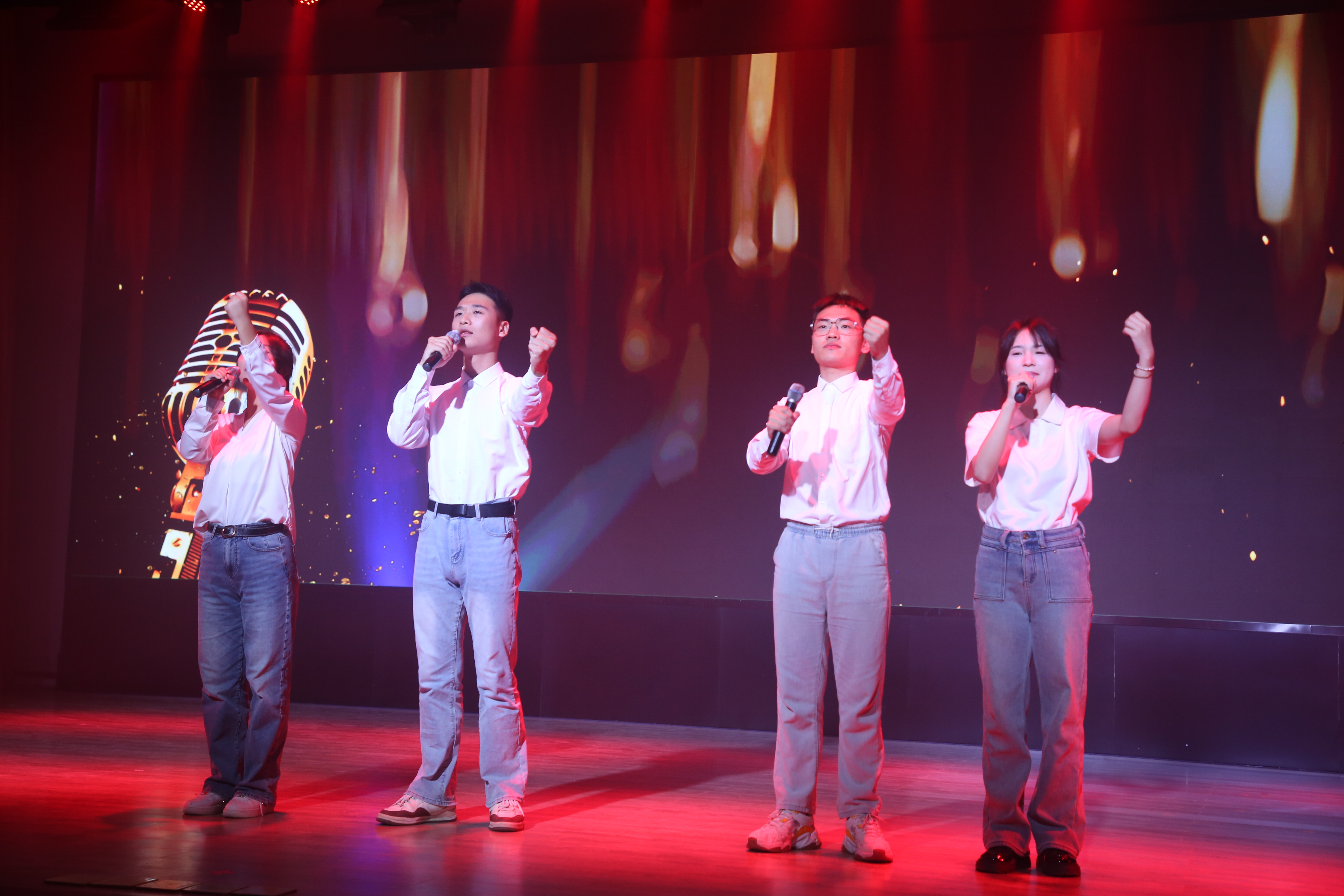 演出在学校大学生艺术团舞蹈《万泉河水》中拉开帷幕,紧凑欢快的节奏和优美的舞姿瞬间点燃了现场氛围。《春江花月夜》《面朝大海春暖花开》《宽阔心胸》等经典作品让大家沉浸在文化的海洋中,感受着朗诵带来的心灵震撼和情感共鸣。《烟台的海》《诗意中国》等美文为大家展开了一幅幅波澜壮阔的祖国画卷,将诗歌的韵律和意境完美融合。随后,一首《如愿》将活动的氛围带入高潮,台下掌声不断,由校园广播电台同学们共同演绎的《朗诵的力量》诠释了诗歌的魅力和力量,最后全体演员和颂《读中国》,为本次演出活动画上了圆满的句号。