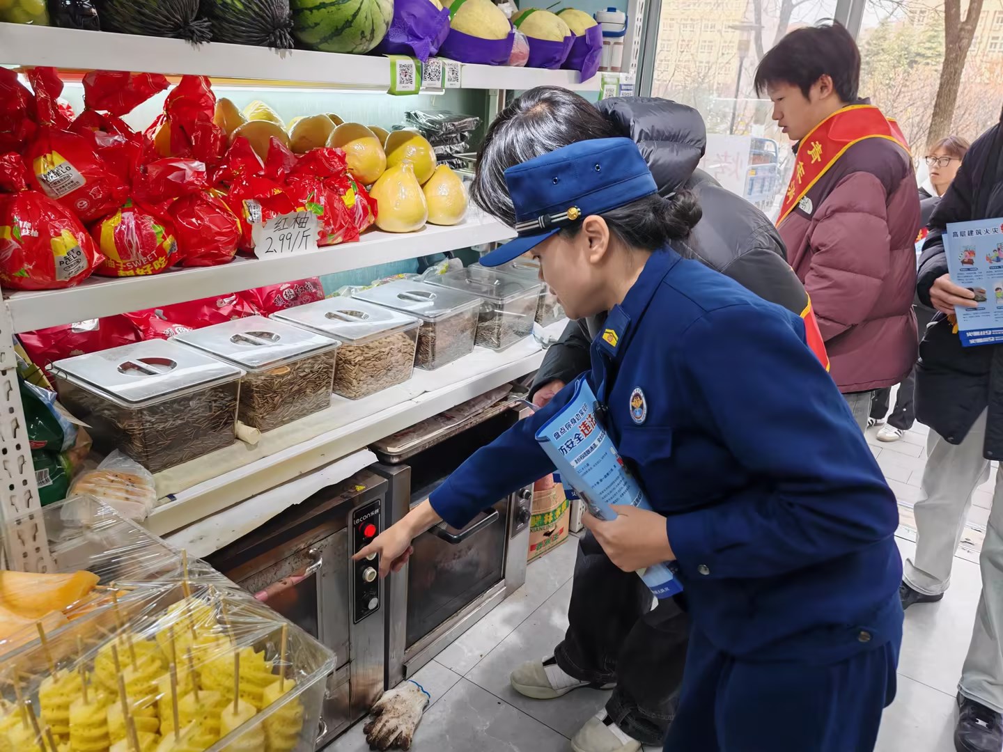 消防救援大队宣传员带领我校消防志愿者到商业网点、学生宿舍内查找消防隐患,主要围绕灭火器放置方式是否合理,罐体是否变形、损伤、缺陷,灭火器是否过期,安全出口有无堵塞,可燃物堆积是否及时清理等问题,并针对学生宿舍中存在的违规使用大功率电器、私拉乱接电线、插排未及时断电等消防安全隐患进行了提醒和整改。