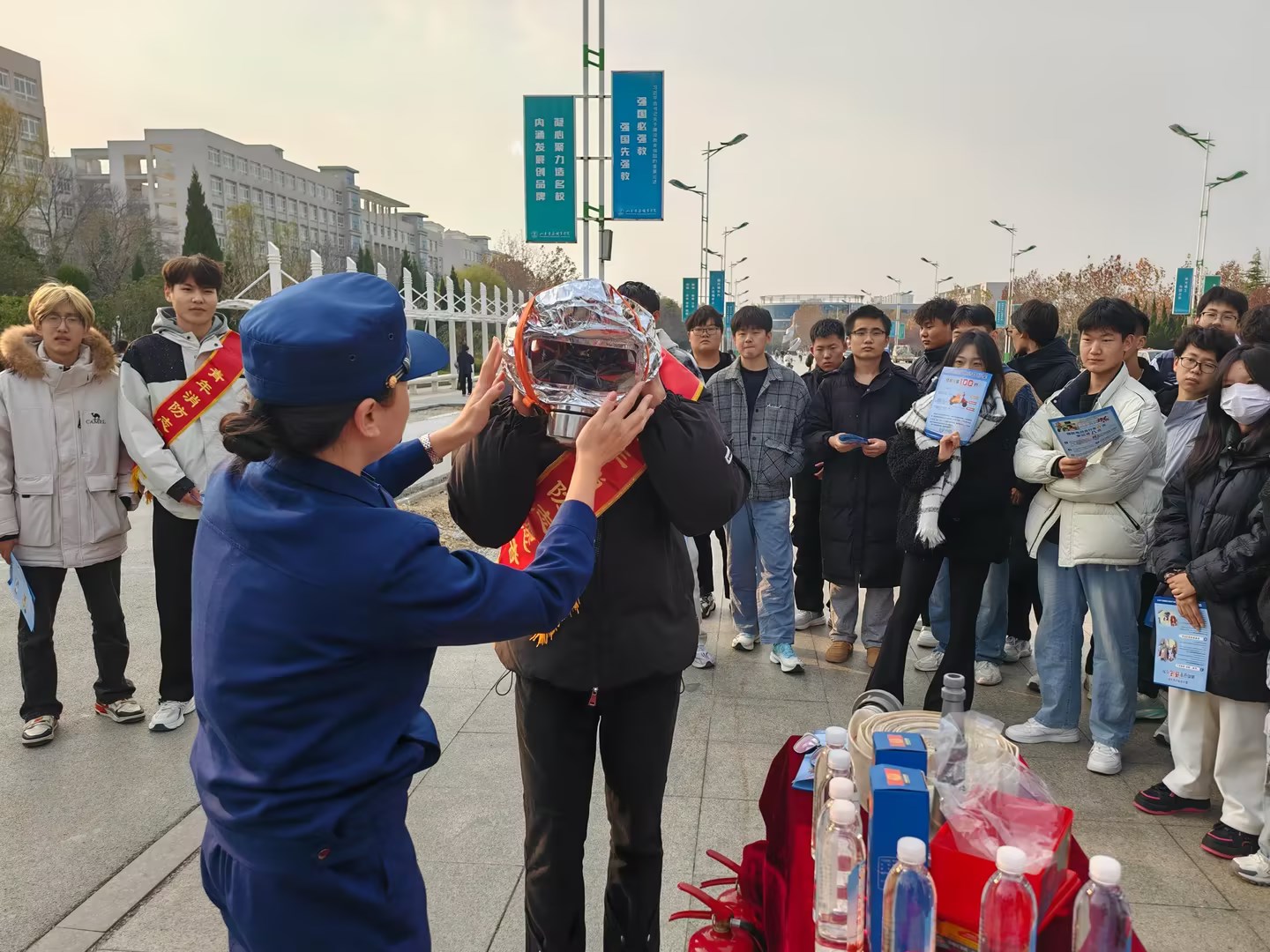 消防救援大队宣传员走进我校,在学校中心大道开展活动。消防宣传员讲解灭火器、消防水带、过滤式自救呼吸器等常见消防设施器材的使用方法,讲解了火灾疏散逃生的注意事项,向我校消防志愿者发放了消防主题宣传册,宣传消防安全知识,在现场进行了消防安全知识有奖问答,并结合最近几年校园发生的火灾案例,向消防志愿者们讲述了学校消防安全的重要性和必要性。