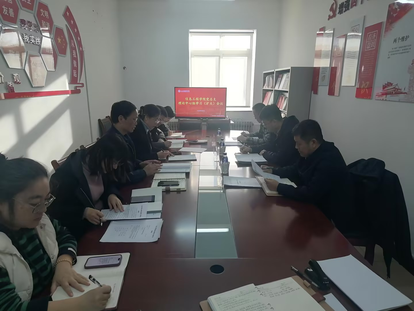 本站讯 12月4日下午,信息工程学院党总支在实训楼E407室召开党总支理论学习中心组学习(扩大)会议。学校党委委员、副校长孙玉林列席旁听并点评。学校列席旁听工作组成员宫国学、闫伟嘉列席会议。会议由信息工程学院党总支书记王九福主持,信息工程学院党总支班子成员、副科级以上干部及专职组织员参加了会议。