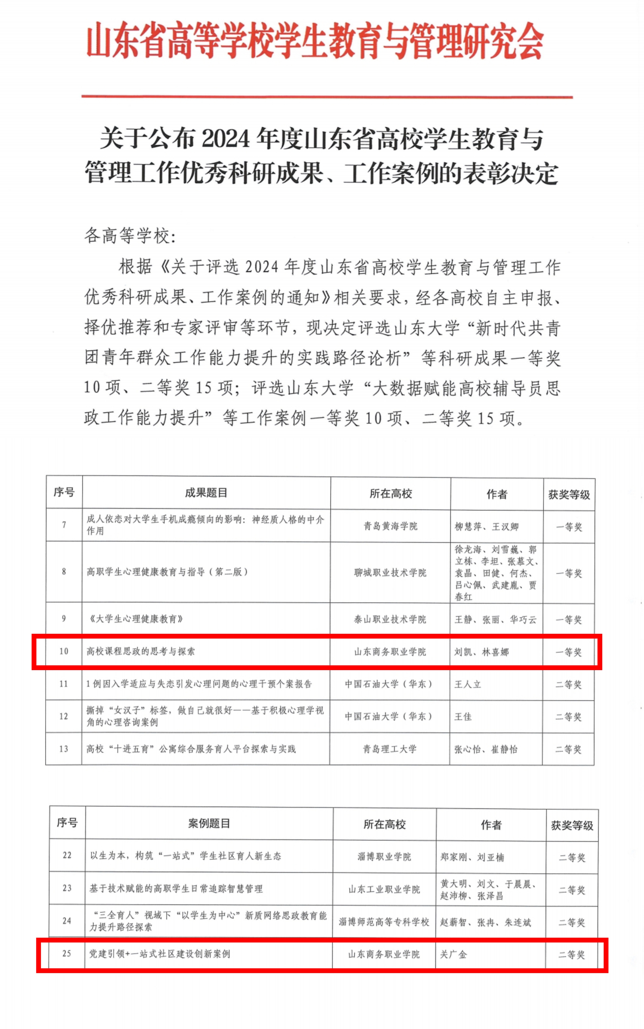 本站讯 近日,山东省高等学校学生教育与管理研究会公布了2024年度学生教育与管理工作优秀科研成果、优秀工作案例评选结果,我校推荐的《高校课程思政的思考与探索》荣获优秀科研成果一等奖,《党建引领+一站式社区建设创新案例》荣获优秀工作案例二等奖。