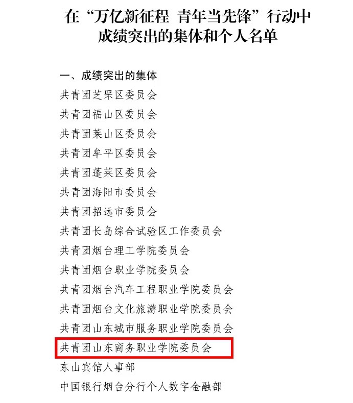 本站讯 近日,共青团烟台市委发布了《关于表扬在“万亿新征程 青年当先锋”行动中成绩突出的集体和个人的通报》,学校在本次行动中荣获“成绩突出集体”荣誉。 去年2月,烟台全市奋进万亿新征程动员大会召开,动员全市上下奋力谱写新一轮跨越发展新篇章。共青团烟台市委发起“万亿新征程 青年当先锋”行动,号召全市广大青年立足岗位实际,加强学习、锐意进取,建功万亿新征程,提速青年发展友好型城市建设。