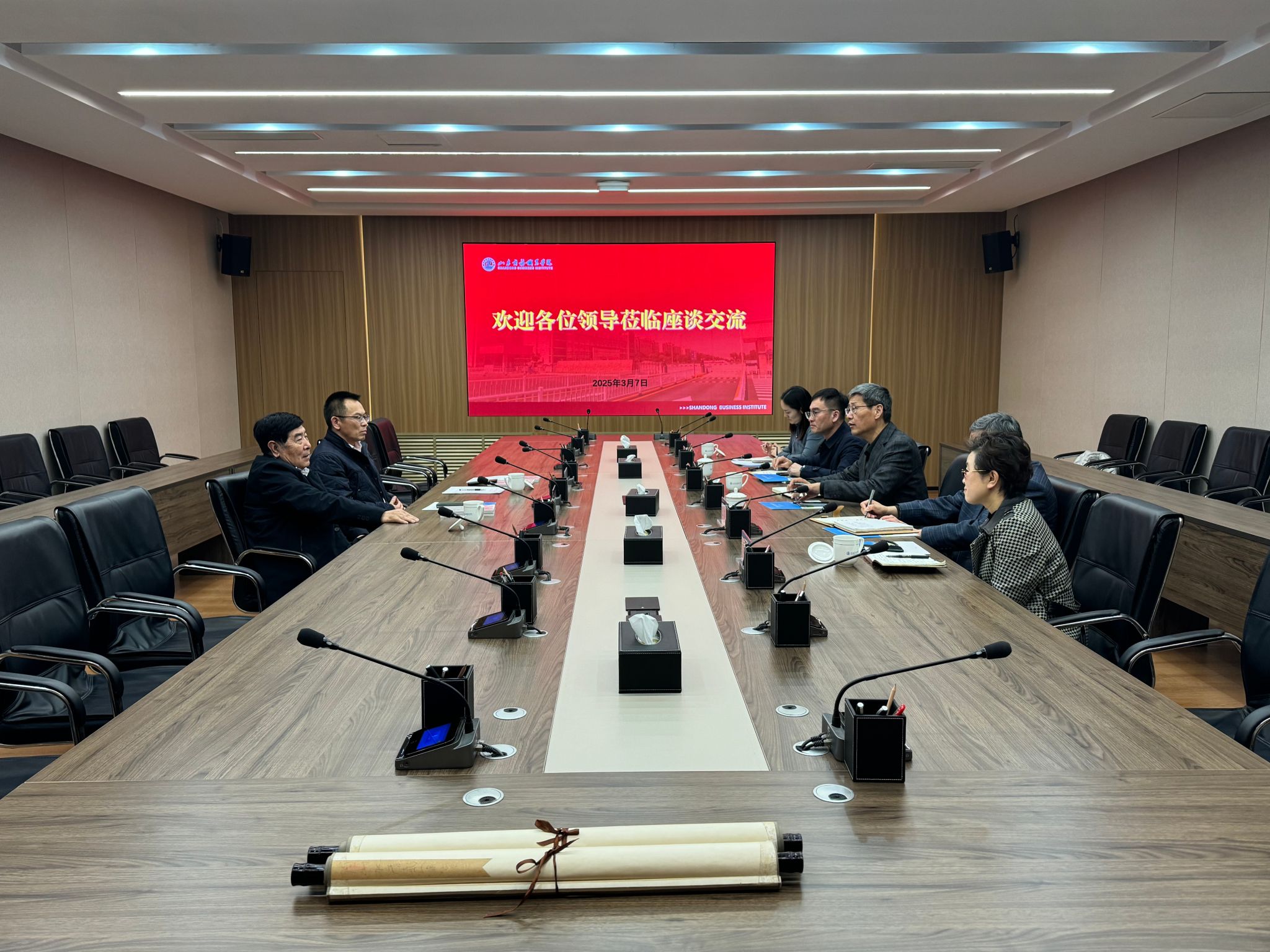 本站讯 3月7日上午,烟台大学原党委副书记于文书、烟台摄影家协会副会长李巍一行来我校,围绕“深化校际合作,推进全民美育”主题召开美育工作交流会。会议聚焦《烟台市全民美育工程三年行动方案(2025-2027)》的落地实施,就高校美育示范基地建设路径展开深入探讨,学校党委书记孙云茂,党委副书记、校长王发明,党委委员、宣传统战部部长孙芹宝,艺术设计学院院长万礼,基础教学部美育教研室主任王毓红等参加会议。