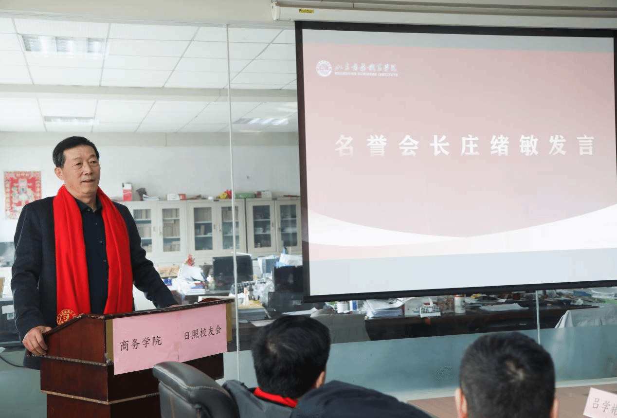 宫国学宣读《关于同意山东商务职业学院日照校友会成立的决定》以及《关于山东商务职业学院日照校友会第一届理事会聘任的决定》。