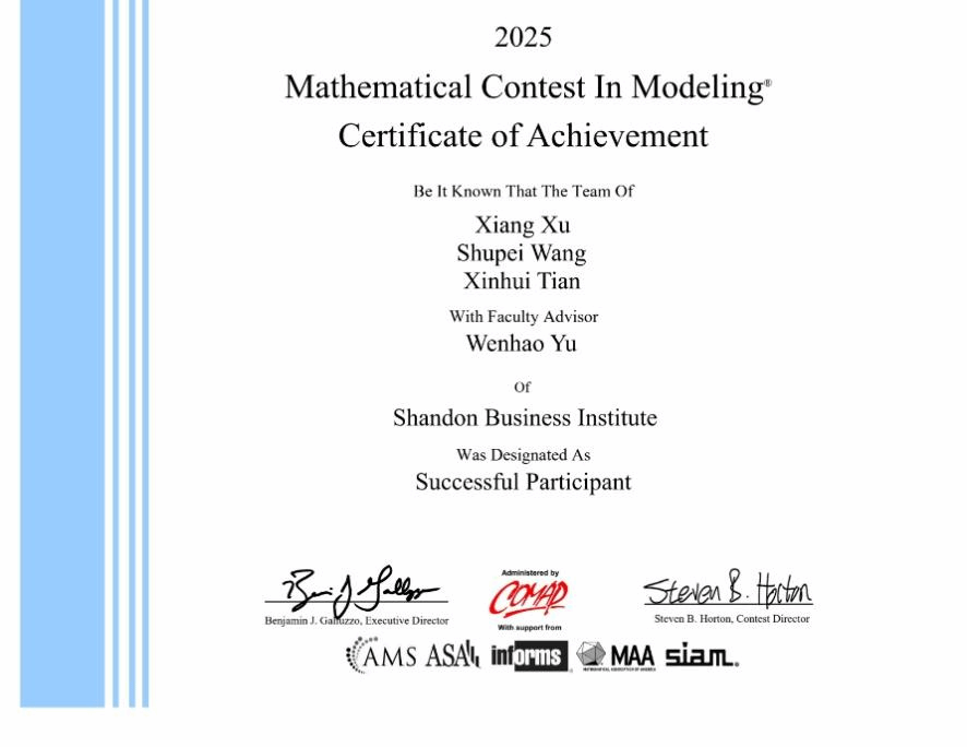 本站讯 近日,美国大学生数学建模竞赛获奖名单公布,我校智能制造学院王淑配、徐翔、田欣卉三位同学组成的团队荣获国际三等奖。