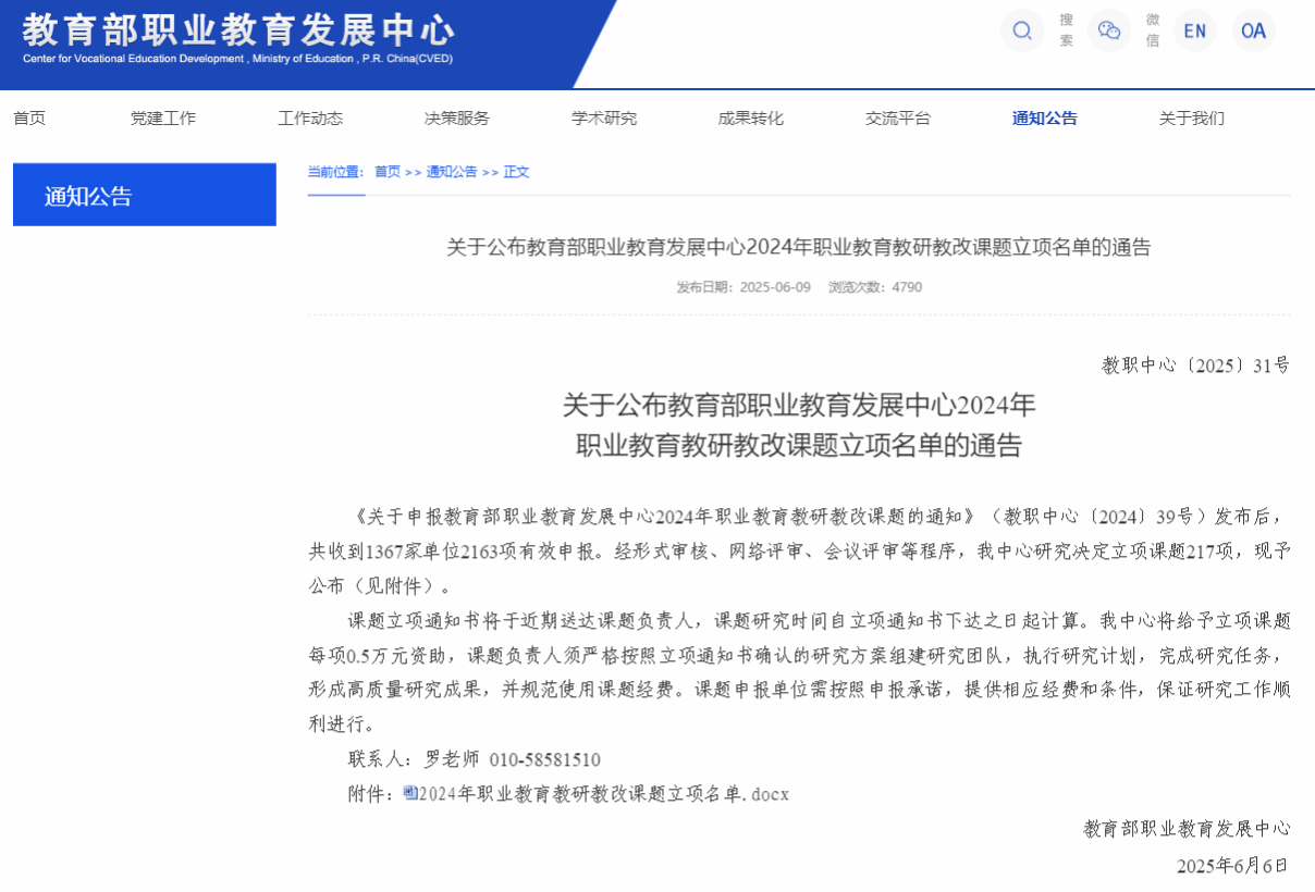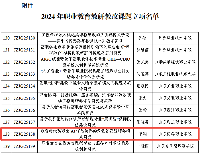 本站讯 教育部职业教育发展中心近日公布2024年度职业教育教研教改课题立项名单,我校智能制造学院机械制造教师团队申报的《数智时代高职生AI信息素养的角色互嵌型培养模式研究》课题从全国2163项申报中脱颖而出,标志着研究团队在职业教育教学改革与创新方面的探索得到了国家层面的高度认可。