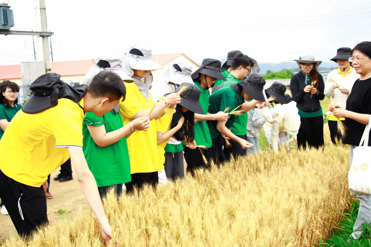 “何为理想的小麦品种?高产是基础,更要兼顾抗病、抗倒、营养品质……”田间实操前,烟台市农科院高级农艺师孙妮娜为师生作了一堂深入浅出的“移动课”。从选种环节的田间表型评判标准,到育种流程的复杂逻辑,再到现代育种技术的支撑作用,“育种是一门连接田间经验和尖端技术的学问”。师生簇拥于麦地旁,问题不断迸发:“这些品种未来会走向何处?农民增收吗?”孙妮娜坚定回应道:“我们所追求的不止于实验室成果,更是要让新种子真正在广袤田野中生根。”学生也借机思考课本中所学的粮食供应链中加工与营养的环节链接点,不断增强“粮”和“食”整体技术的创新思考。