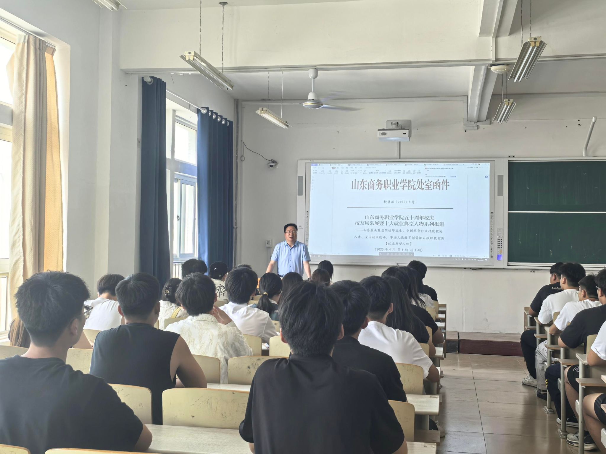 课堂上,张越以学校五十载发展历程为主线,为同学们深情讲述了学校从1975年建校初期“白手起家、艰苦创业”的奋斗岁月,到如今发展成为山东省特色鲜明的高职院校的辉煌历程。从当年几十人的小规模办学,到如今万名学子的现代化校园,每一步发展都凝聚着商务职院人的智慧与汗水。