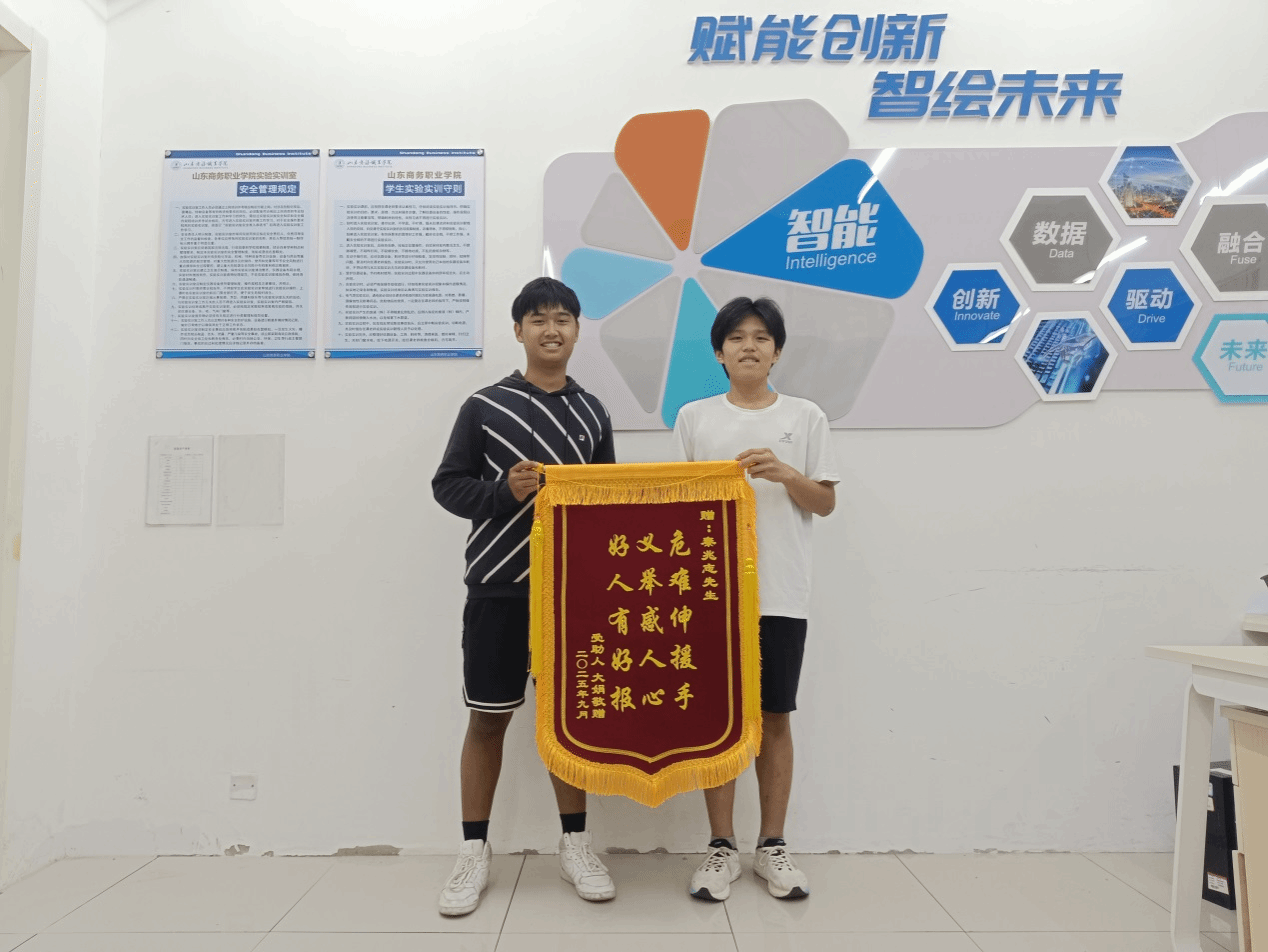 本站讯 9月16日,一面写有“危难伸援手 义举感人心 好人有好报”的锦旗送至我校,揭开了两位学子在今年暑假见义勇为、冷静施救的感人故事。信息工程学院2024级人工智能1班学生秦兆志、张弘烨,在街头面对突发危急情况沉着应对、高效协作,成功救助一名因高烧休克昏迷的儿童,以实际行动诠释了我校“商务学子”核心品质。