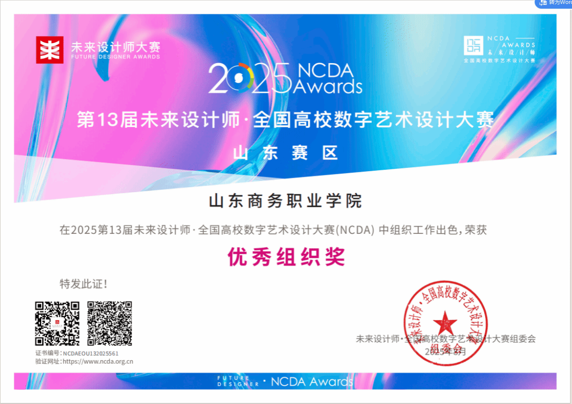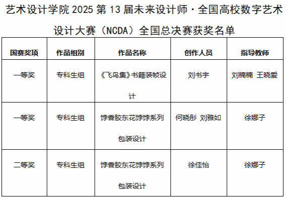 此次在NCDA大赛中取得的佳绩是艺术设计学院育人实力的集中展现,更是学院迈向高质量发展的有力起点。未来,学院将继续以师资建设为核心、以教学改革为动力、以实践创新为路径,着力培养兼具家国情怀、国际视野与过硬本领的新时代设计人才,在服务国家战略与地方产业发展中彰显更大作为。(通讯员:姜俊岐 撰稿:李艳彩 审核:王晨 于洋 梁倩 值班审核:周书囡)