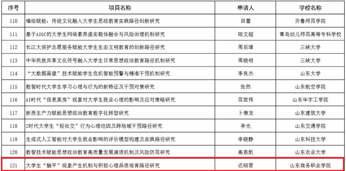一直以来,学校始终高度重视学生心理健康教育工作,积极营造阳光成长的校园文化氛围。迟昭君老师此次获批的课题,旨在激发大学生内生动力,培养其乐观向上、坚韧不拔、勇于担当的积极心理品质,聚焦当前大学生群体中备受关注的“躺平”现象,深入剖析其产生的内在机制与外部诱因,有针对性构建积极心理主动干预与培育模型,并重点探索积极心理品质培育的有效路径。该课题研究内容与新时代高校学生心理健康教育与思想政治工作的核心需求高度契合,对解决学生成长困惑、引导学生树立积极向上的人生态度具有重要的现实意义,为新时期高校落实“立德树人”根本任务、培养担当民族复兴大任的时代新人提供坚实的学理支撑与实践方案。