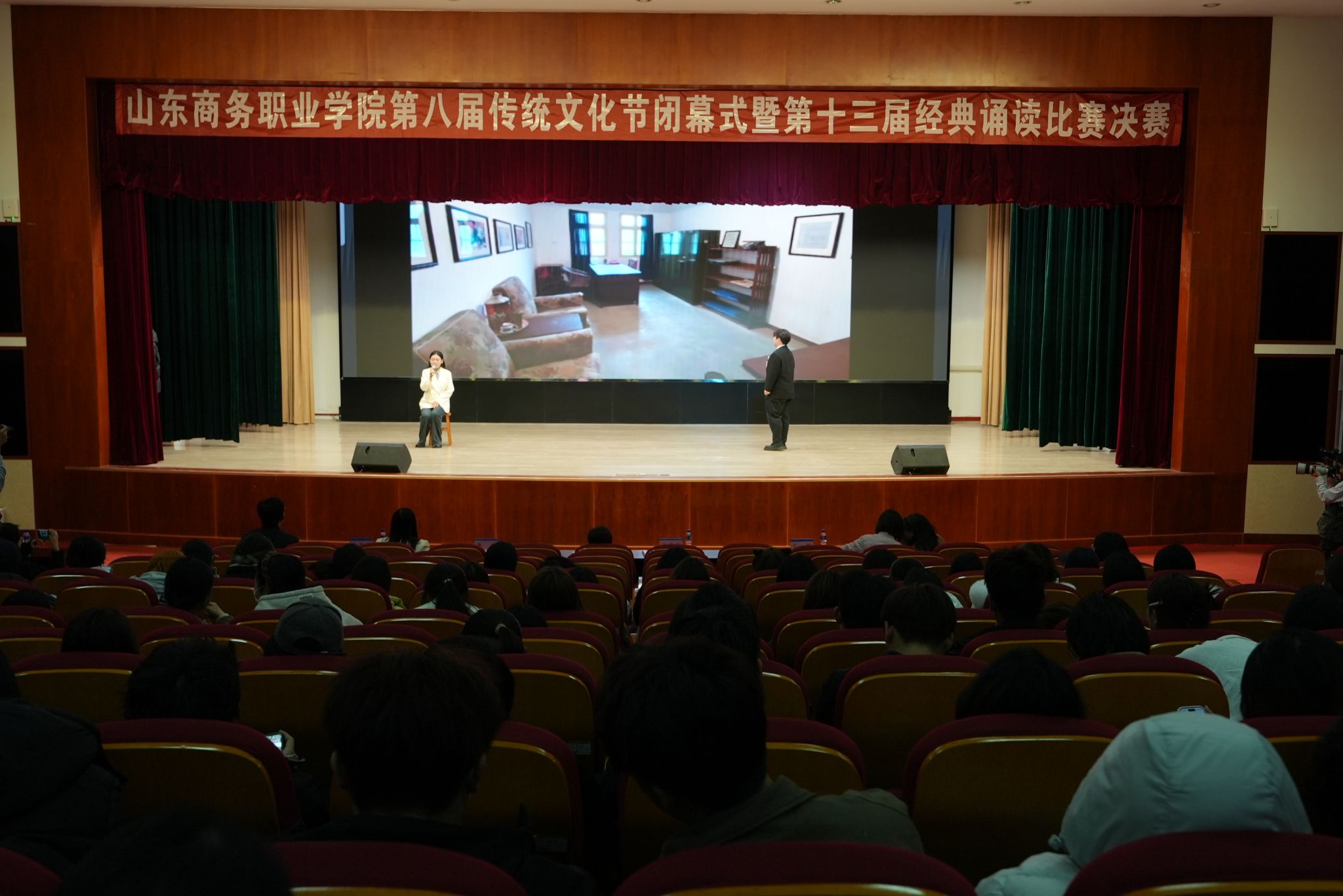 本站讯 11月14日下午,我校第八届传统文化节闭幕式暨第十三届经典诵读比赛决赛在音乐厅举行。学校党委委员、宣传统战部部长孙芹宝、基础教学部主任李刚、学生工作处(团委)副处长杨建辉、图书馆副馆长王林以及来自各二级学院的相关负责人、师生代表齐聚现场,共同见证这场传统文化与青春活力交织的舞台展演。