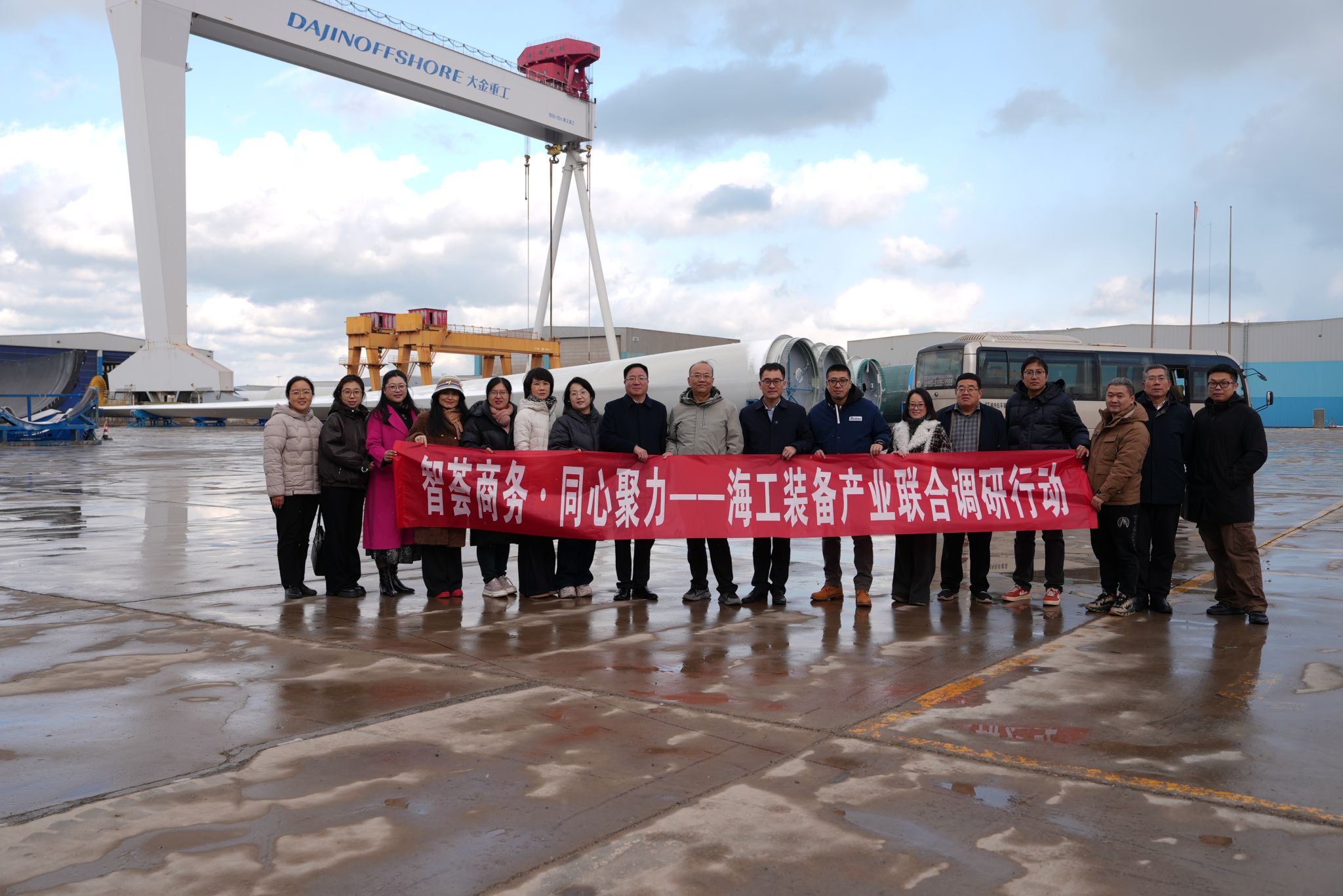 此次联合调研由民盟山东商务职业学院支部牵头,联合学校其他统战团体并邀请民盟烟台市委共同开展,是践行海洋强市战略、扎实推进产教融合的重要举措。会前,参会人员先后走进大金重工有限公司、东方电气风电(山东)有限公司、巨涛海洋重工有限公司三家行业龙头企业实地考察,近距离感受烟台海工装备产业向高端化、智能化迈进的强劲态势。