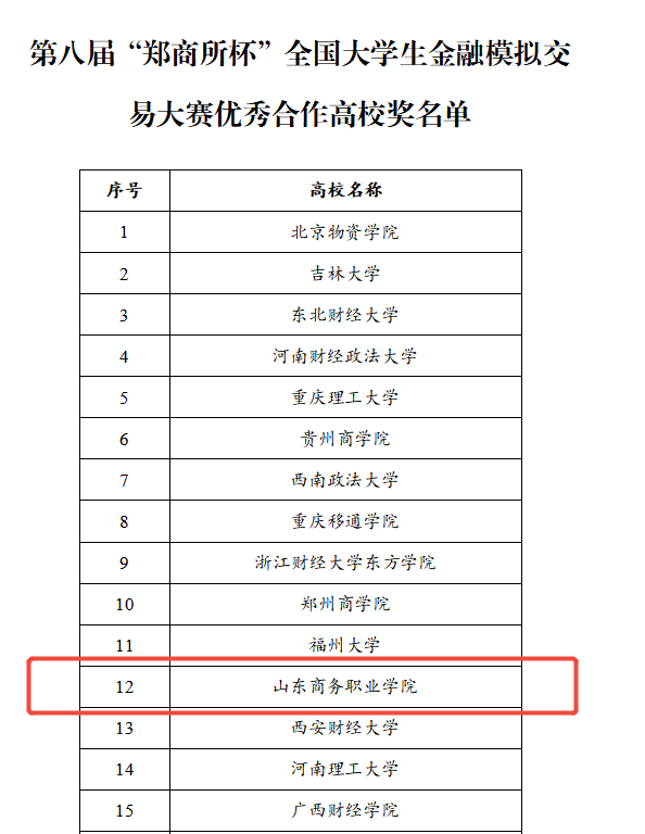 本站讯 在山东省高校教师党支部书记“双带头人”工作室与全国高校 “双带头人” 教师党支部书记 “强国行” 专项行动团队的助力下,近日,我校会计金融学院7名学生凭借扎实的专业功底与出色的实践能力,在郑州商品交易所主办的第八届“郑商所杯”全国大学生金融模拟交易大赛脱颖而出,斩获个人奖项,同时学校获评“优秀合作高校奖”,充分彰显了在党建引领下,金融实践教学的突出育人成果。