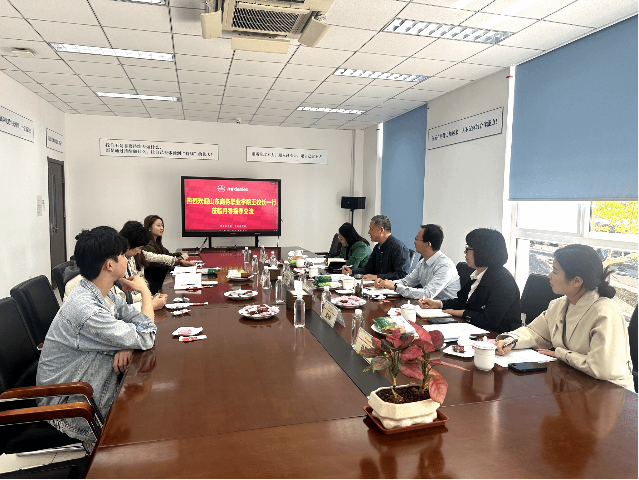 本站讯 4月24日,学校党委副书记、校长王发明,党委委员、纪委书记魏才奎带队赴青岛丹香投资管理有限公司开展专题调研,就丹香订单班合作事宜深度洽谈,并与2026届在岗实习学生亲切交流。粮油食品学院负责人及校企合作与就业工作处相关人员陪同调研,青岛丹香投资管理有限公司董事长刘承云、人力资源部部长杨逢春与优秀学生代表参与座谈。
