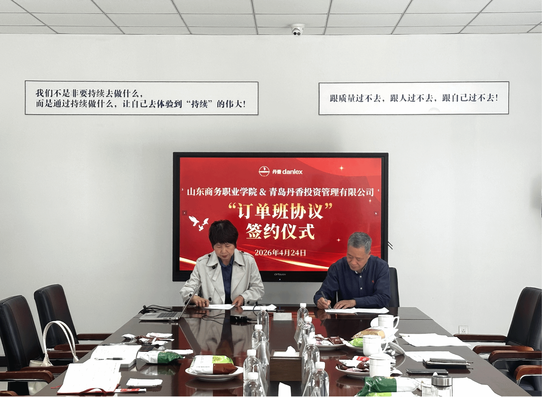 王发明校长首先阐明此次调研的核心目的,随后校企双方围绕企业人才需求趋势、岗位能力标准、课程体系适配性、学生专业能力与综合素质培养等关键议题展开深入研讨。王发明指出,企业秉持的长期主义精神与深耕发展心态,与学校对学生“沉下去、稳得住、静下来”的培养要求高度契合。订单班作为校企协同育人、推进实习就业一体化的重要载体,能够精准对接企业需求,提升人才培养与岗位需求的匹配度,既有助于提高学生就业留存率、实现高质量充分就业,也能降低企业用人成本、助力企业稳健发展,最终实现学校、企业、学生三方共赢。经过充分交流与磋商,校企双方正式签订丹香订单班合作协议,这标志着双方在产教融合、实习就业等领域的合作迈入全新阶段。