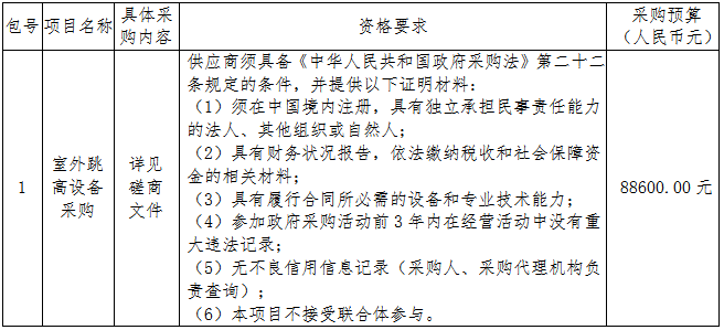 四、采购项目分包情况:山东商务职业学院室外跳高设备的供货、安装调试及售后等相关服务;供货安装期:自接到采购人通知后7日历日内供货安装调试完毕;本项目划分为1个包。