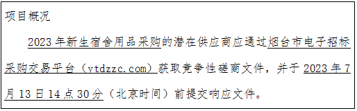 采购需求:本项目为2023年新生宿舍用品采购,共分为一个采购包,采购预算为192730.00元,具体要求详见竞争性磋商文件第二部分采购内容及服务要求。