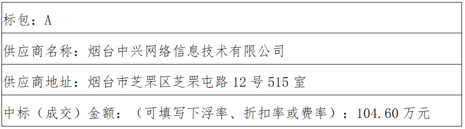 标包A:烟台中兴网络信息技术有限公司(96.7、97.7、98.7)、山东东华信息技术有限公司(70.85、71.85、72.85)、烟台大有数据系统有限公司(84.44、87.44、87.44)、烟台相和通信科技有限公司(58.67、60.67、61.67)