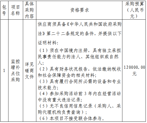 四、采购项目分包情况:监控增补点位采购及相关服务;完成期限:自接到采购人通知后20日内供货安装调试完毕并验收合格;本项目划分为1个包。