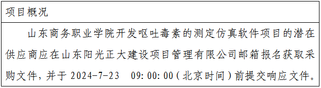 3.方式:电子邮箱报名,须将加盖单位公章的营业执照(或事业单位法人证书等相关证明材料)、汇款证明(开户名称:山东阳光正大建设项目管理有限公司烟台分公司,开户银行:恒丰银行股份有限公司烟台上夼西路支行,账号:853540120122703359,对公转账,不接受个人转账打款)、所报项目名称、项目编号、项目联系人、联系方式发送至邮箱sdygzdyt@163.com。