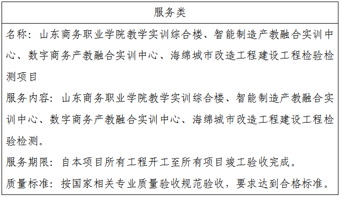 二、项目名称:山东商务职业学院教学实训综合楼、智能制造产教融合实训中心、数字商务产教融合实训中心、海绵城市改造工程建设工程检验检测项目