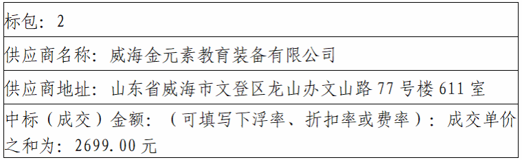 标包A:威海金元素教育装备有限公司(96.00、97.00、95.00)、山东坤森教学设备有限公司(96.74、95.24、91.74)、、山东屹海贸易有限公司(90.42、88.42、89.42)、烟台泛音文化传媒有限公司(90.32、88.32、85.32)、烟台智安电子有限公司(85.04、82.54、81.04)