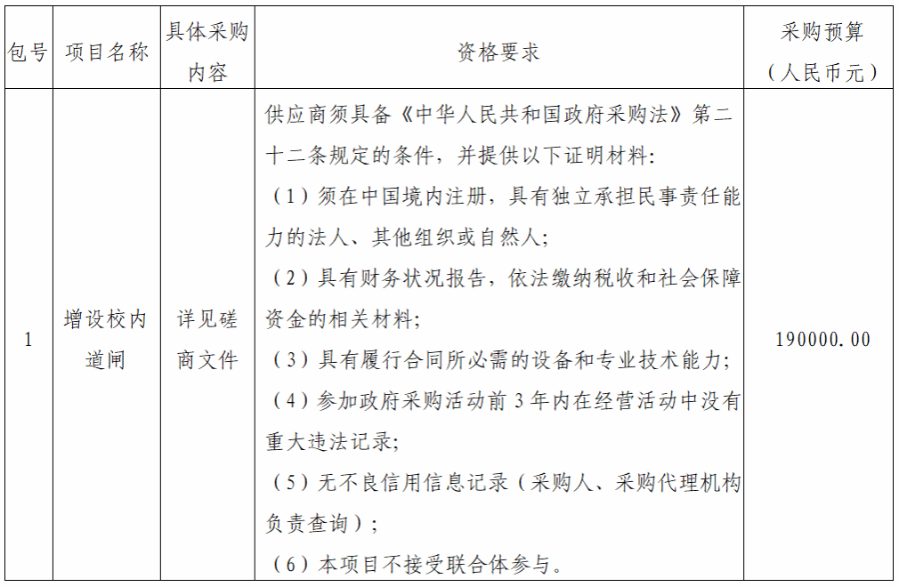 四、采购项目分包情况:本项目为增设校内道闸,本项目共划分为一个包;交付期:自接到采购人通知后 10 日内供货安装调试完毕。