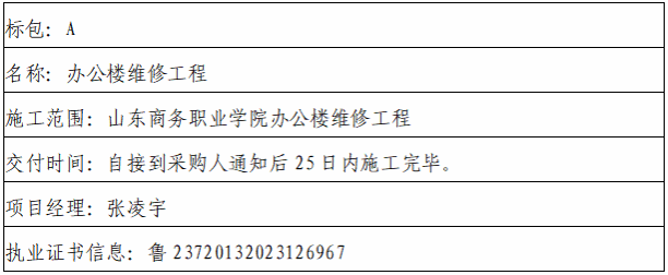 标包A:烟台市飞和建筑工程有限公司(76.5、86.0、88.0)、山东亨谷建设工程有限公司(77.24、79.24、83.24)、烟台市顺盛建筑安装有限责任公司(73.32、79.32、84.82)