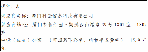 标包:A 厦门科云信息科技有限公司(94.5、95.00、95.00) 厦门禹衡软件有限公司(90.37、78.86、93.37) 厦门云众优学信息科技有限公司(89.57、84.57、92.57)