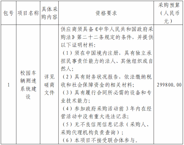 四、采购项目分包情况:本项目为校园车辆测速系统建设,共划分为一个包;交付时间:自接到采购人通知后 20日内供货安装调试完毕。