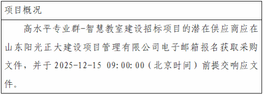 方式:电子邮箱报名:须将加盖单位公章的营业执照(或事业单位法人证书等相关证明材料)、汇款证明(开户名称:山东阳光正大建设项目管理有限公司烟台分公司 ,开户银行:恒丰银行股份有限公司烟台解放路支行,账号:37250101150100000391)、所报项目名称、项目编号、项目联系人、联系方式发送至邮箱sdygzdyt@163.com。根据山东省政府采购有关规定,凡有意参加本次政府采购的供应商必须在2025年12月11日17时00分(北京时间)前在中国山东政府采购网上进行注册、报名,注册并报名成功后,再按照电子邮箱报名程序获取磋商文件。供应商未按上述要求注册报名并向代理机构登记备案购买磋商文件导致无法参加的,由供应商自行承担相应后果和责任。报名电话:0535-6898911。