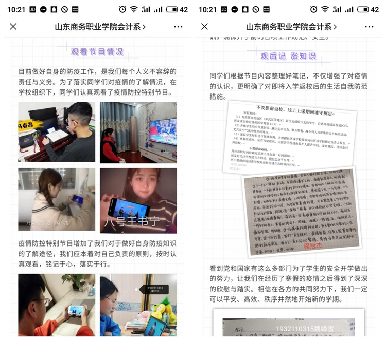 为进一步扩大宣传力度,进一步提高学生对新冠肺炎的认识。会计系利用网上公开课的资源,组织学生一起学习,并利用知识竞答的方式检验学生学习成果。会计系组织学生观看了《新课堂——同心战“疫”特别节目》《思政大课》、开学前疫情防控规范培训特别节目;组织学生参加山东省教育厅关于组织开展大学生安全知识学习答题活动。