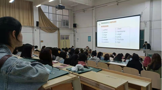 臧金辉老师结合自己多年的留学考试培训经验从英语学习入门技巧、英语学习对大学生的意义、雅思初步认知、海外生活四个板块进行分享,激发了学生对英语学习的热情。在活动体验环节,同学们热情高涨,兴味盎然地参与了背单词、猜词义、学发音等各项小活动,在活动过程中,我们发现我校学生对英语有较多的需求,通过老师提供的学习技巧,学生能快速记忆单词和纠正发音。参加此次活动的王云珂同学表示,这个讲座对自己的英语学习很有帮助,让自己了解到学习英语的内在价值,减轻了对英语学习的恐惧心理,尤其是讲座上提到的英语学习方法让自己受益匪浅。