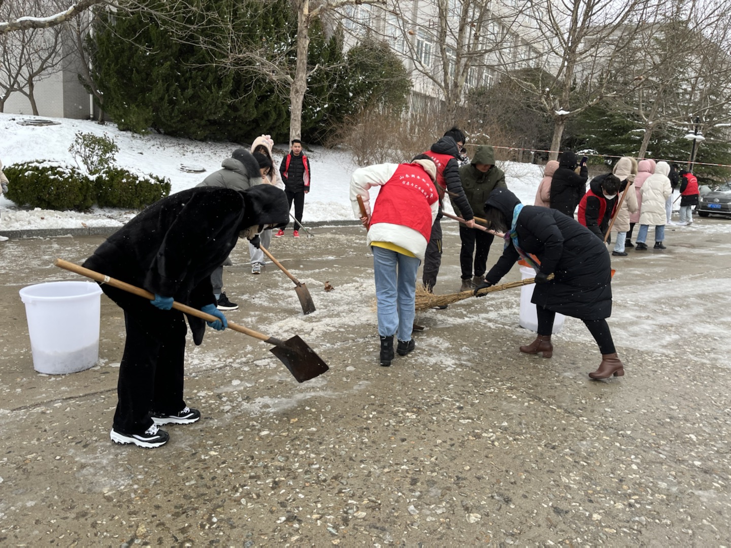 路上寒风凛冽,路面积雪厚重,尤其是过往车辆的来回碾压,路面结冰,增加了扫雪除冰的难度。在学院党总支书记肖永霞的带领下,所有党员和学生个个干劲十足,虽然气温极低,大家的手和脸都被冻得通红,却丝毫没有影响大家的劳动热情,挥铲、破冰、铲雪、清扫,热火朝天的劳动场面绘成了一道亮丽的风景线。经过连续两个小时的奋战,北外环入口处至实训楼道路上的冰面被清理干净,道路两旁的积雪也被清理至绿化带上,确保校园路面干净整洁,保证了参加大赛车辆和人员的安全通行。