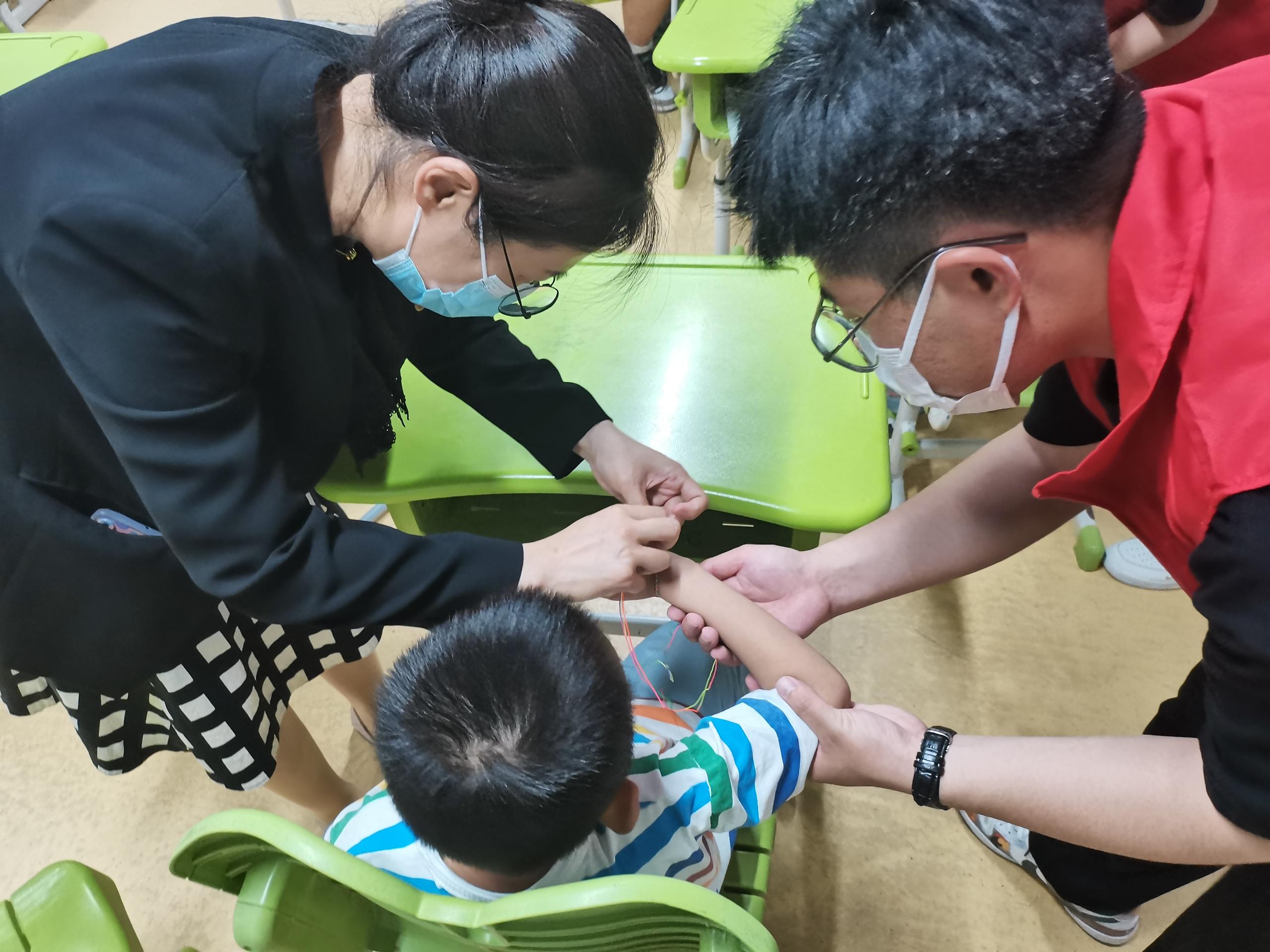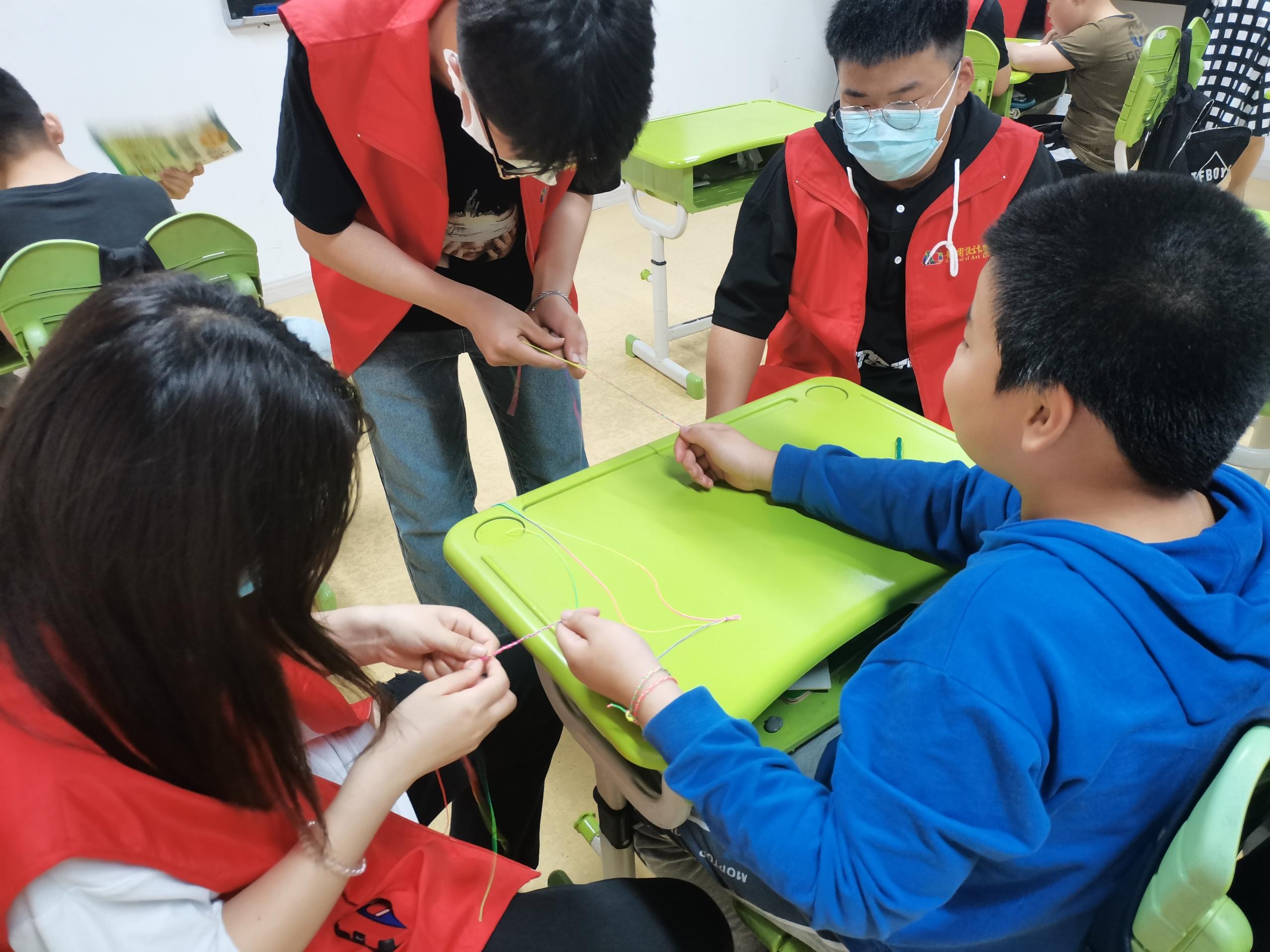 共编五彩绳,祝福萦手腕。活动中,学院师生与舜华培训学校的孩子一起编制五彩绳,师生将美好祝福融入五彩绳中,萦绕在孩子们的手腕上。一名特殊儿童小心翼翼地收好他和学生志愿者共同编制的五彩绳,用并不标准的发音说到:“我要把五彩绳送给妈妈”,孩子的纯真和善良让现场的师生感动。