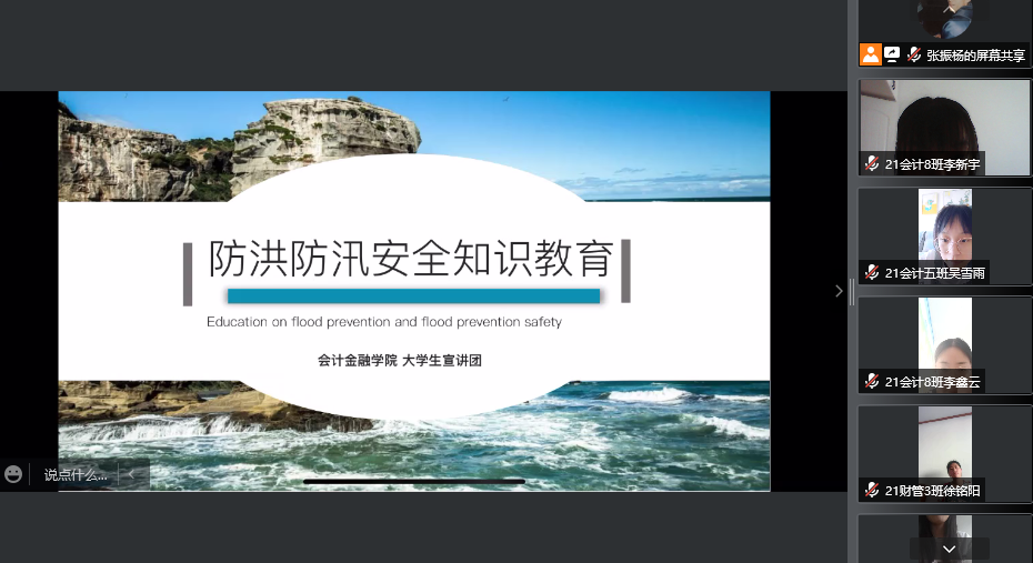 大学生宣讲团首先通过腾讯会议进行了线上防汛知识普及,从防汛基本知识、紧急自救措施、其他灾害自救三个方面进行了系统的学习,通过典型案例讲解防汛、防水、防溺水等安全知识,提高自身避险自救能力,进一步增强防汛安全意识。