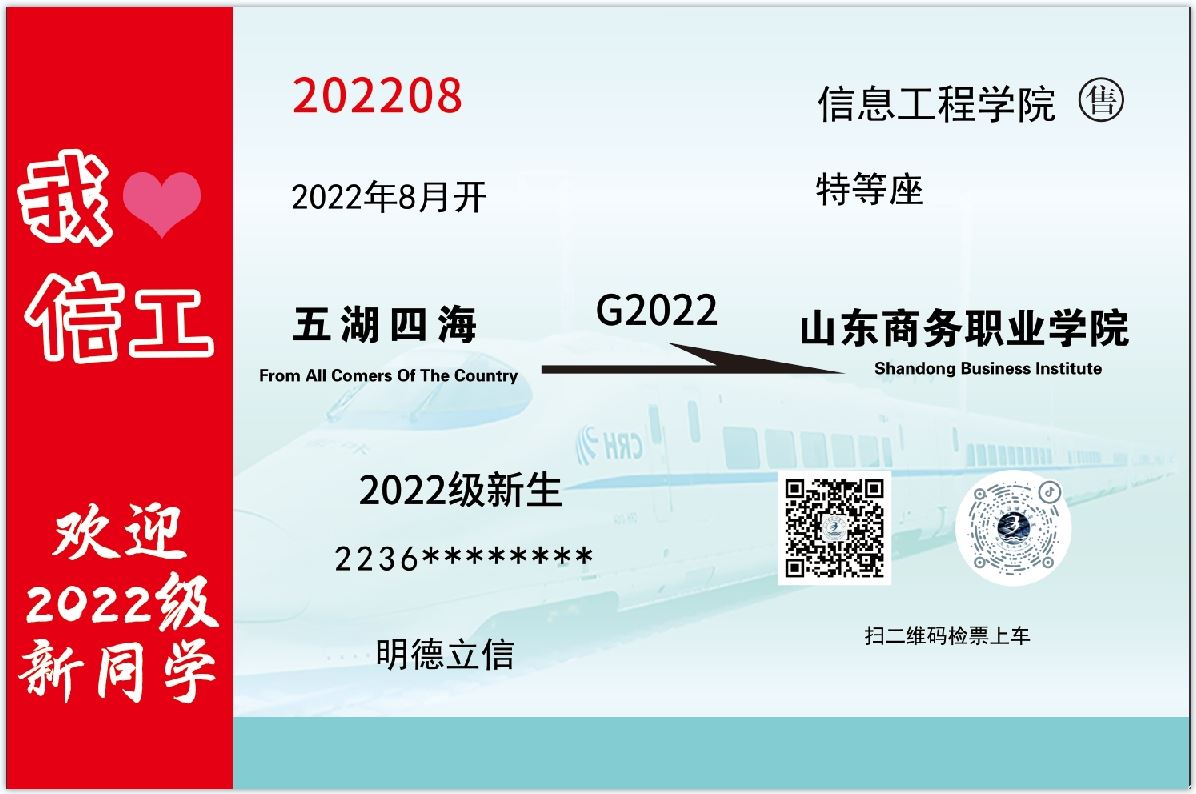 学院特意为新生DIY了一张“入学车票”,寓意新生乘特等座从五湖四海来到学校,开启新的人生旅程。新生们也将搭乘“信息工程学院号”青春列车,坚定无畏地开启大学生活。