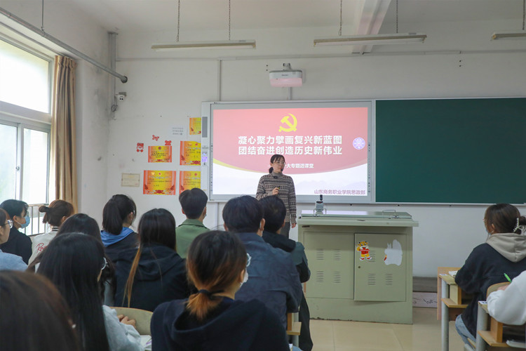 在课堂教学中,采取专题式教学方式,在深入学习领会党的二十大报告精神实质和丰富内涵的基础上,找准与课程相关的知识点,设置若干专题,采取研讨式教学、案例式教学等多种方式有机融入党的二十大精神。思政教师通过梳理党的二十大精神主线,引导学生在党的二十大报告中寻找问题答案,在与学生分享自身的发展、学校的发展以及烟台的发展中,让学生体会在中国共产党的带领下,我们这十年发生的伟大变革。同时结合习近平总书记在党的二十大报告中对青年的寄语,坚定学生信仰信念信心,让学生围绕学习宣传党的二十大精神进行课堂展示和实践作业。课堂教学中紧凑的环节、丰富的案例、多样的教学方法,让学生在潜移默化中深刻领悟党的二十大精神,并将这种精神贯彻到今后的学习生活中,为全面建设社会主义现代化国家贡献自己的一份力量。
