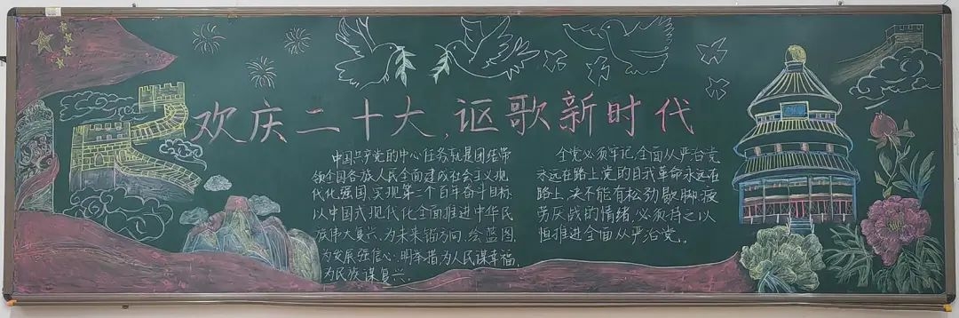各班黑板报围绕“欢庆二十大,讴歌新时代”主题,经过细心设计、精心制作,图文并茂,色彩鲜艳,内容有对党史知识的普及、有对红色基因的传承、还有对新时代抗疫精神的弘扬。同学们用手中的画笔诠释了“感党恩,听党话,永远跟党走”的誓言和决心,充分展现了学院师生坚定的理想信念和积极向上的精神风貌。